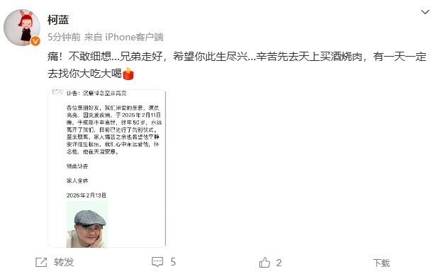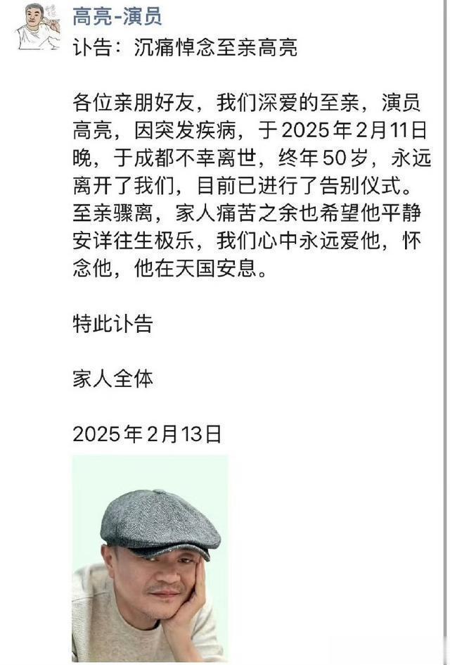 2月13日,演员高亮家属在朋友圈发布噩耗,透露高亮在2月11日于成都病逝,终年50岁。